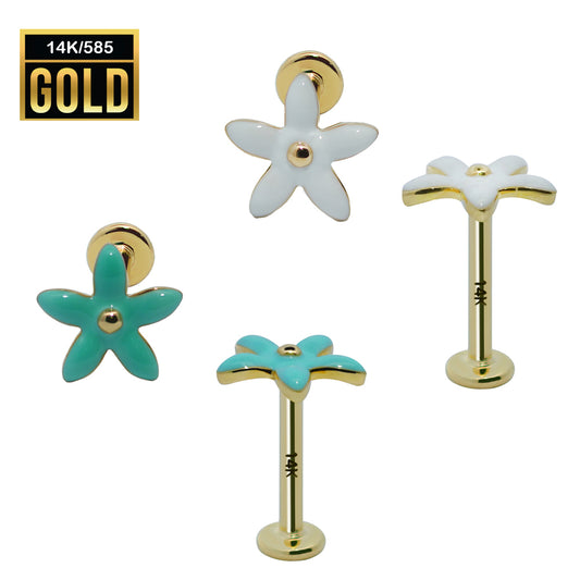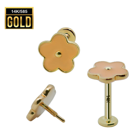Diseño de flor de labio interno en oro real de 14 quilates con pétalos pintados con esmalte en la parte superior