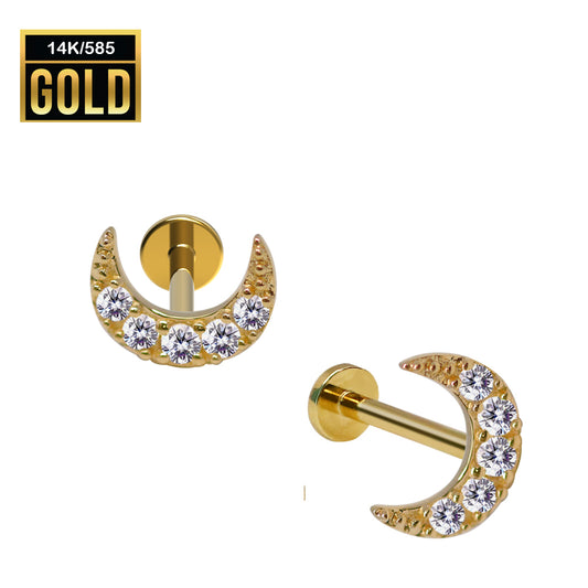 Labret interno de oro real de 14 quilates con circonita cúbica superior en diseño de luna